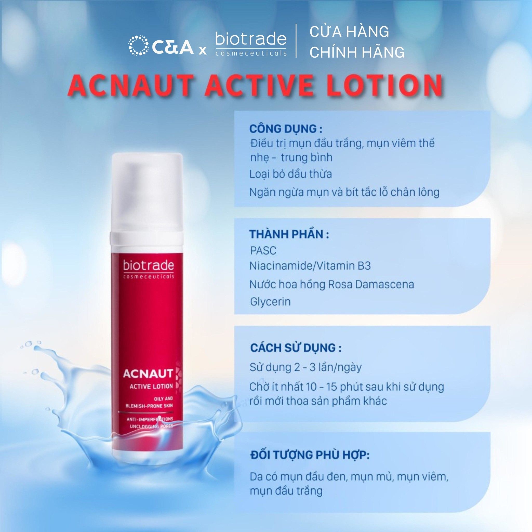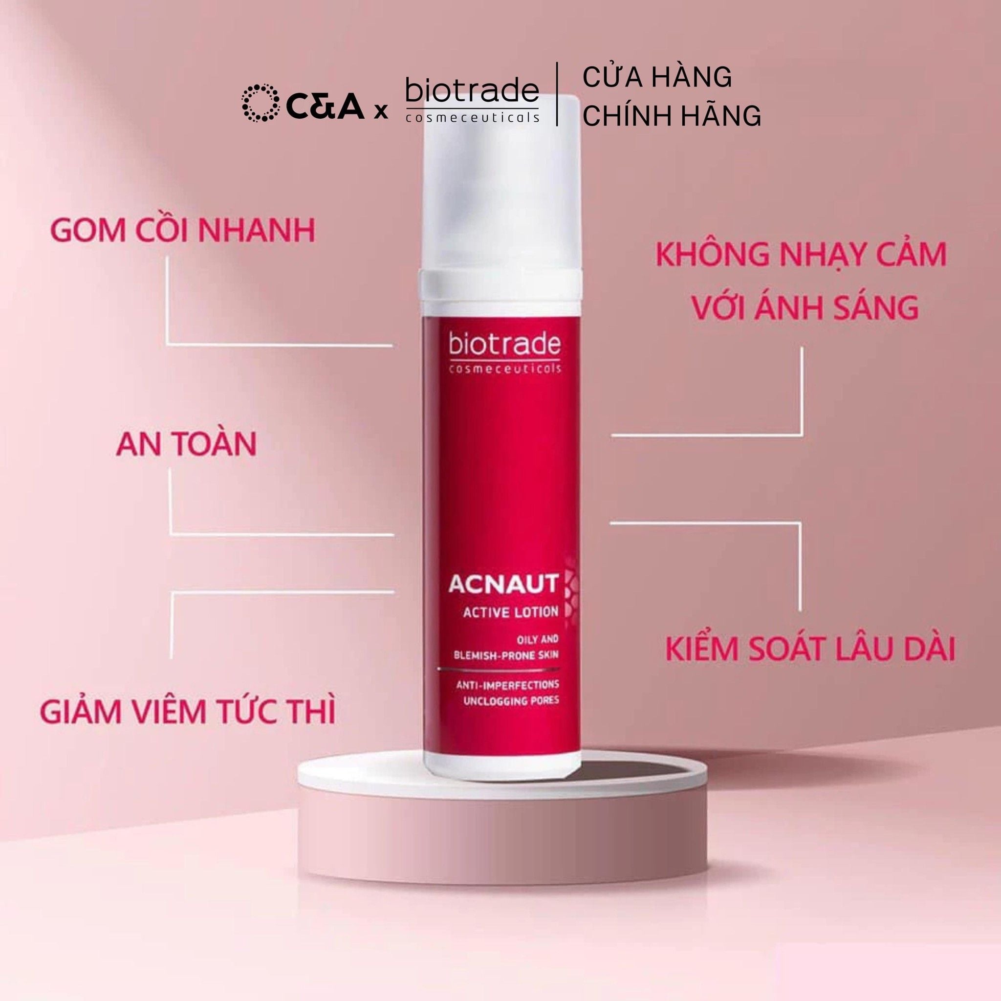 Biotrade Acnaut Active Lotion là dung dịch chấm mụn chuyên biệt giúp hỗ trợ giảm nhanh các dạng mụn mủ, mụn viêm, mụn dậy thì và mụn ẩn. Với công thức không bắt nắng và tác động vào cả 4 yếu tố hình thành mụn, sản phẩm giúp làm khô còi mụn, giảm viêm đỏ và hạn chế tái phát trong thời gian ngắn.