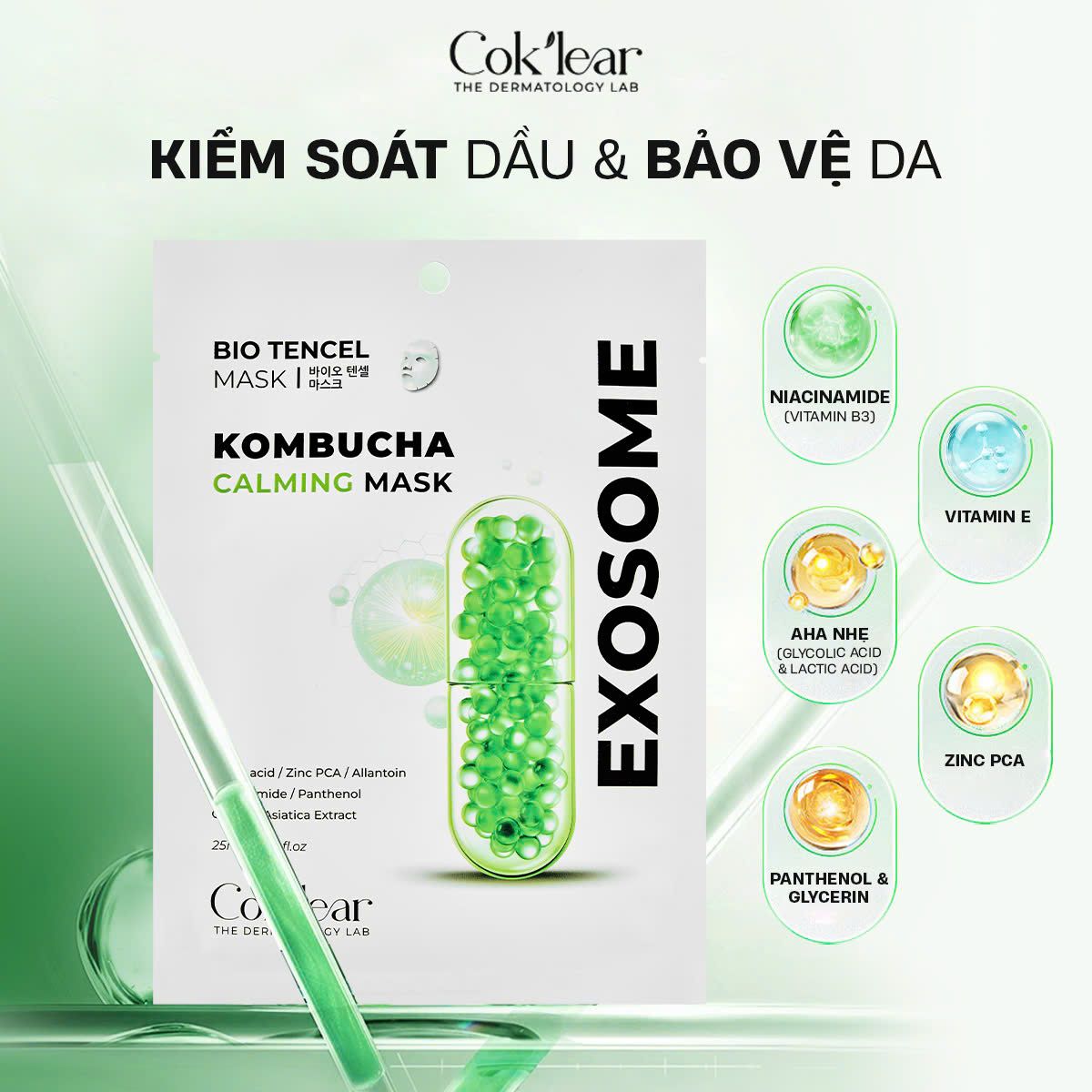 CoK'lear Exosome Kobumcha Calming Mask là một bước tiến đột phá trong công nghệ mặt nạ dưỡng da, định vị là giải pháp chuyên sâu cho làn da dầu mụn và nhạy cảm. Sản phẩm kết hợp sức mạnh phục hồi của các thành phần từ rau má tinh khiết (Asiaticoside, Madecassic Acid, Asiatic Acid, Madecassoside), khả năng làm dịu và kháng khuẩn của Kombucha, cùng với sự hỗ trợ của các hoạt chất kiểm soát dầu hàng đầu như Zinc PCA và Niacinamide. Đây không chỉ là một sản phẩm làm dịu thông thường mà còn là liệu pháp "tái cân bằng" giúp da khỏe mạnh, giảm mụn và sáng mịn.