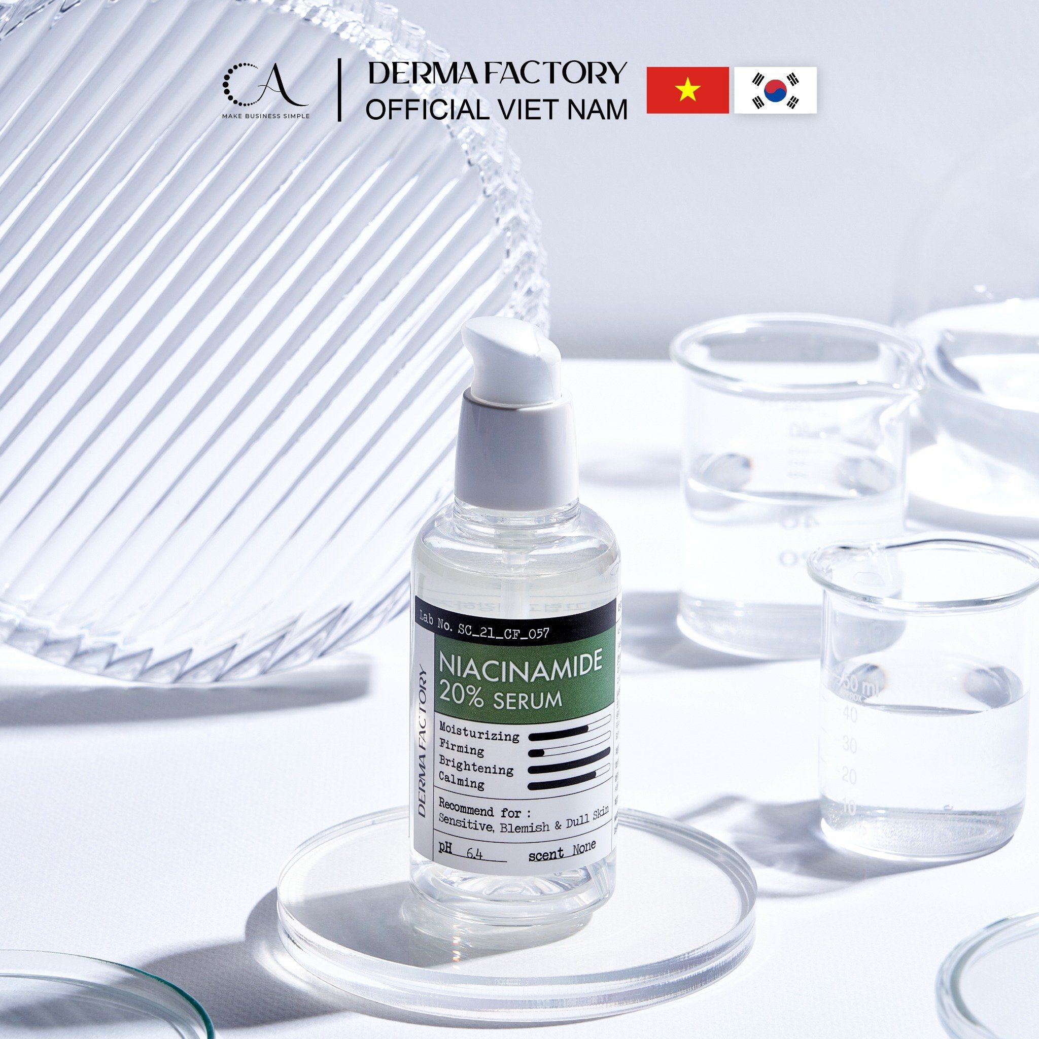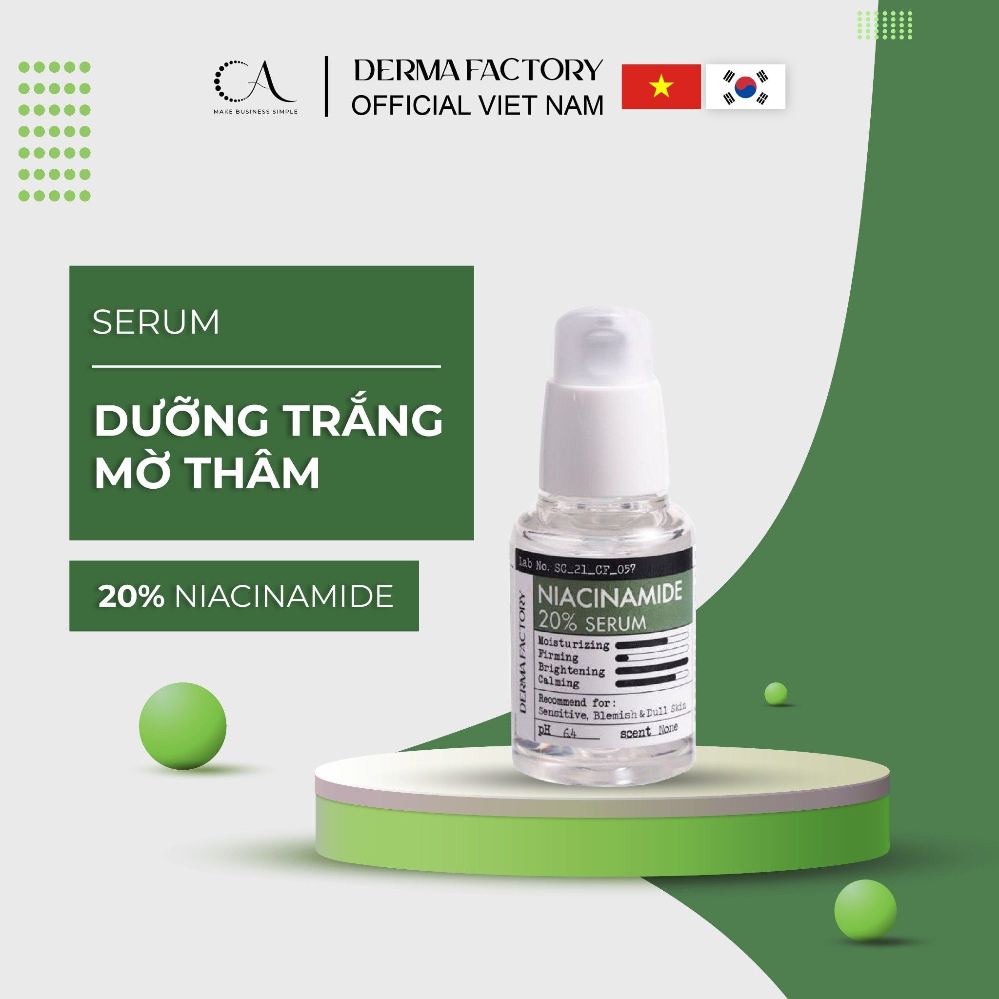 Derma Factory Niacinamide 20% Serum là tinh chất dưỡng da thuần chay, tập trung vào công thức tối giản nhưng hiệu quả cao. Với nồng độ Niacinamide (Vitamin B3) lên tới 20%, sản phẩm giúp làm sáng, cải thiện sắc tố, hỗ trợ kiểm soát bã nhờn và mang lại làn da đều màu, khỏe mạnh. Công thức được Viện Quản lý Dược phẩm và Thực phẩm Hàn Quốc (KFDA) chứng nhận về khả năng dưỡng sáng da, an toàn cho cả làn da nhạy cảm và dễ nổi mụn. Công thức và Thành phần chính