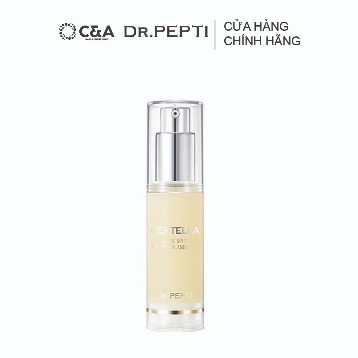 Dr.Pepti Centella Dark Spot Solution Ampoule 30ml là tinh chất dưỡng trắng cao cấp, tập trung xử lý thâm – nám – xỉn màu nhờ phức hợp làm sáng Mela Control Complex và 50,568% chiết xuất rau má tinh khiết. Kết cấu ampoule thấm nhanh, không bết dính, không gây bí da, mang lại cảm giác nhẹ thoáng – lý tưởng cho thời tiết nóng ẩm. Sản phẩm giúp làm sáng da, làm mờ đốm nâu, cải thiện độ đàn hồi và phục hồi da tổn thương do mụn hiệu quả.